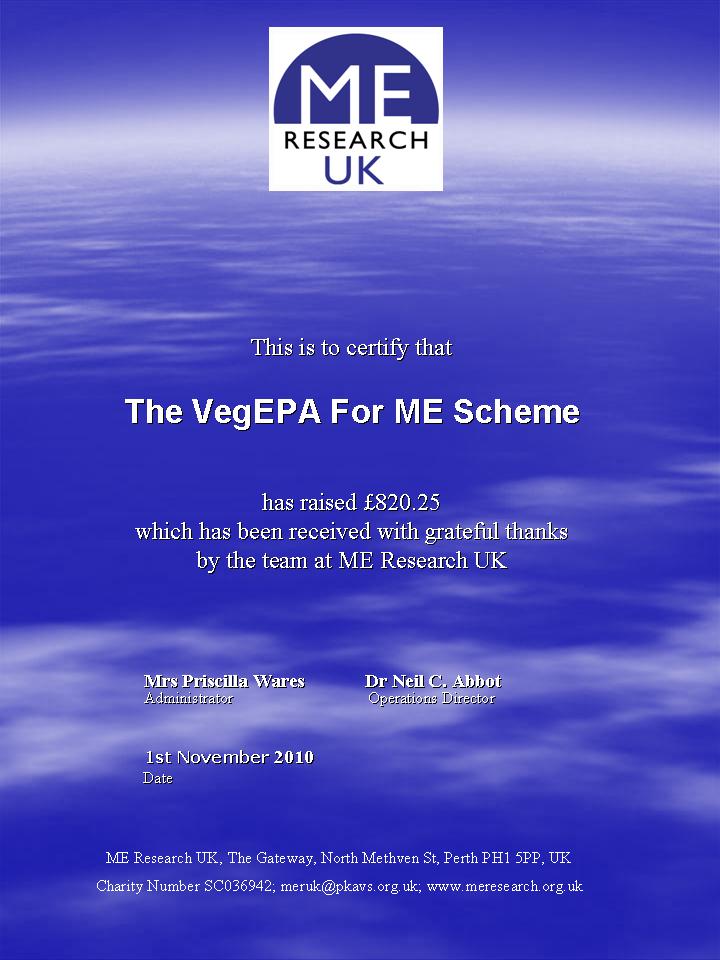 1010-Vegepa-Certificate Published 8th November 2023 at 720 × 960 in Our donations to ME Research – so far almost £80k!