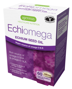 Echiomega echium seed oil is a complete source of vegetarian omega-3-6-9 good fats. Its unique content of ALA & SDA boosts levels of the important omega-3 EPA 60% more than other plant oils such as flaxseed. By supporting EPA and DHA levels this supplement offers brain, heart and eye health benefits.