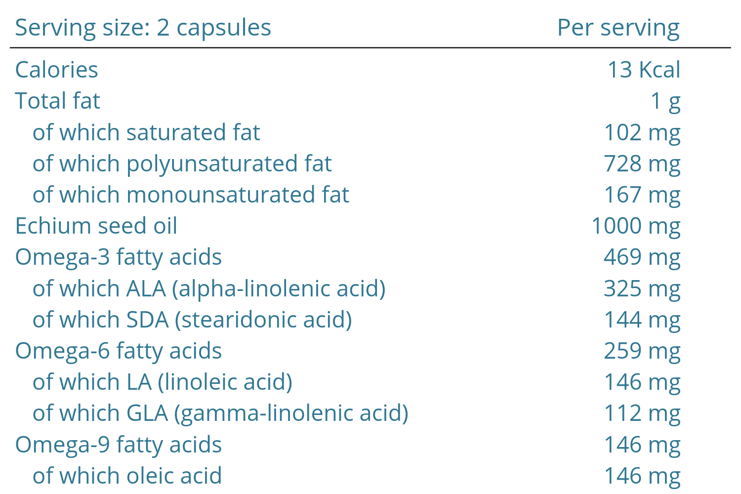 Ingredients: Echium seed oil; capsule shell (emulsifier: glycerol; modified corn starch; carrageenan; sodium carbonate).